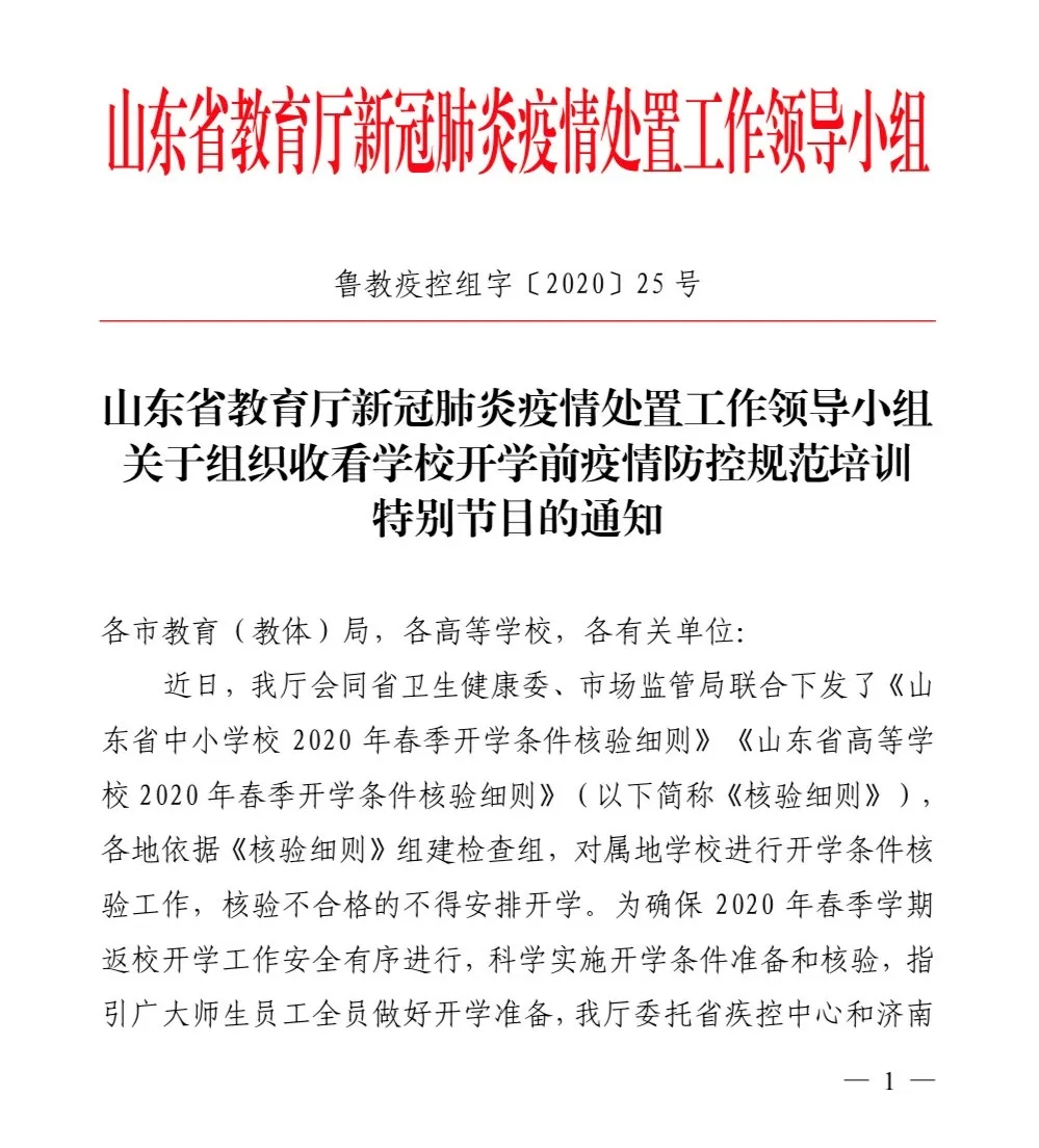 近日,我厅会同省卫生健康委、市场监管局联合下发了《山东省中小学校2020年春季开学条件核验细则》《山东省高等学校2020年春季开学条件核验细则》(以下简称《核验细则》),各地依据《核验细则》组建检查组,对属地学校进行开学条件核验工作,核验不合格的不得安排开学。为确保2020年春季学期返校开学工作安全有序进行,科学实施开学条件准备和核验,指引广大师生员工全员做好开学准备,我厅委托省疾控中心和济南市疾控中心专家,指导录制了开学前疫情防控规范培训特别节目。请各地、各高校组织学生、教师和家长认真收看。现将相关安排通知如下: