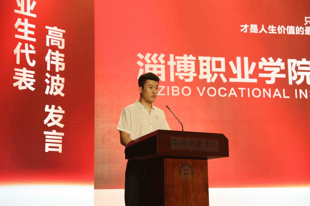 高伟波代表毕业生发言。他由衷地表达了对母校的感激之情,以及对母校、恩师和同学们的美好祝愿,并表示将带着淄职人的勇敢与担当,创造美好的明天。