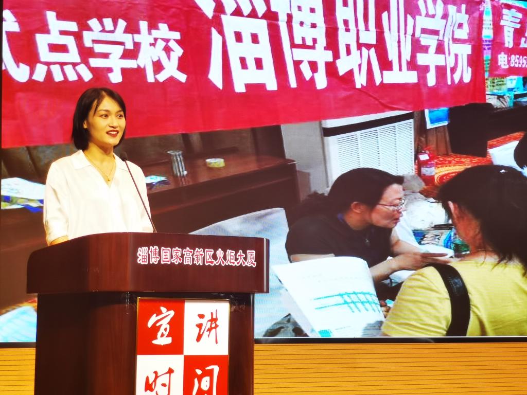 马宁宣讲的题目是《一个老招生的“淄职梦”》,内容以我院合校以来的发展成就为背景,以招生办公室教师刘会华18年的招生工作为主线,描述了一代“淄博职追梦人”为实现梦想无私奉献、努力拼搏的故事。