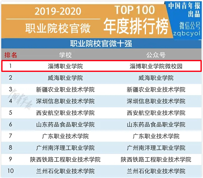 本站讯 今天,中国青年报重磅发布2019—2020年度中国大学官微百强榜单,我院官方微信公众号“淄博职业学院微校园”进入职业院校官微十强位列第一。