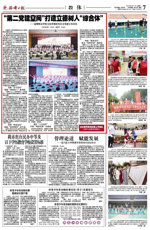 本站讯(通讯员 于海燕)8月17日,《淄博日报》以近半版的篇幅重点推出了《“第二党建空间”打造立德树人“综合体”——淄博职业学院文化传媒系党总支党建工作纪实》的报道。报道指出,文化传媒系党总支在新时代高校基层党建工作中,坚持立德树人根本任务,积极搭建“自习空间”、“宿舍空间”、“人生空间”、“善美空间”,探索“红色引擎”思政育人实践模式,擦亮“第二党建空间”品牌,形成了具有澎湃活力的基层党建工作“综合体”。此次报道,是淄博日报与淄博市教育局联合对全市教育系统党建工作巡礼的一个成果展示。全文如下: