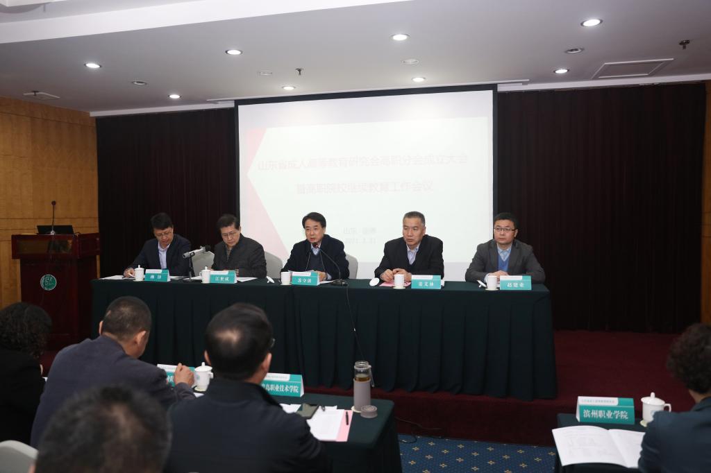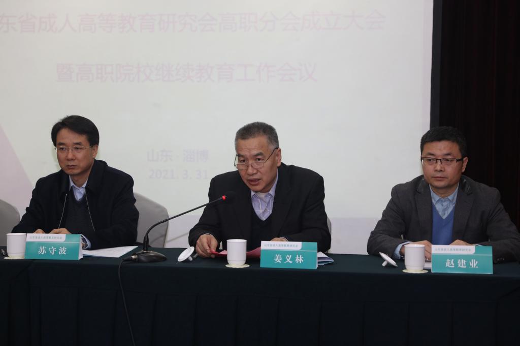 姜义林作为新任会长单位代表讲话。他指出,高职分会是山东省各高职院校高职成人教育的共同平台,要在省教育厅和山东省成人高等教育研究会指导下携手共进,强化高等职业学校的继续教育与社会培训服务功能,为经济社会发展培养更多的高素质技术技能型人才,为高职教育的高质量发展贡献力量。学院作为高职分会的会长单位,感谢上级教育行政部门和研究会的大力支持及各兄弟院校的信任。在今后的工作中学院将履行好会长单位职责,为高职分会提供全方位的保障和支持。