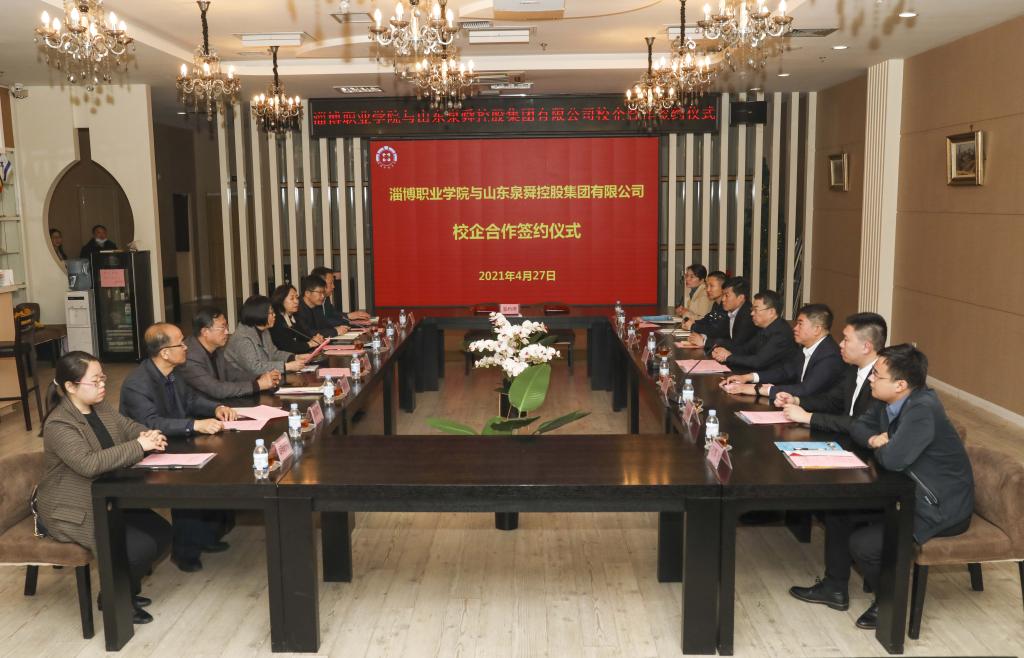 仪式上,杨百梅、赵峰分别代表双方签署了“淄博职业学院—山东泉舜控股集团有限公司校企合作框架协议”和“校企共建电力系统自动化技术专业合作协议”。