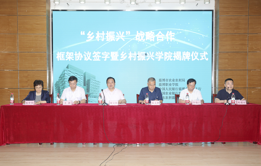 本站讯(通讯员 王晓红)6月16日下午,淄博市“乡村振兴”战略合作框架协议签字暨乡村振兴学院揭牌仪式在我院隆重举行。淄博市农业农村局、人民银行淄博市中心支行、农业银行淄博分行、山东农担淄博管理中心、淄博职业学院签约五方的相关领导出席签字仪式。