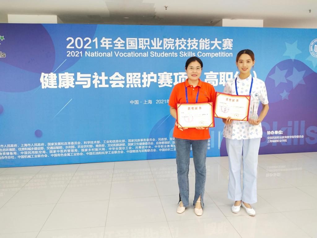 本站讯(通讯员 王静)6月17-20日,2021年全国职业院校技能大赛“健康与社会照护”赛项(高职组)在上海城建职业学院举行,来自全国28个代表队的28名选手参加。护理学院2018级老年服务与管理专业学生赵秀霞代表山东队荣获一等奖,指导教师纪青荣获“优秀指导教师”奖。这是该院连续两年获得该赛项一等奖。