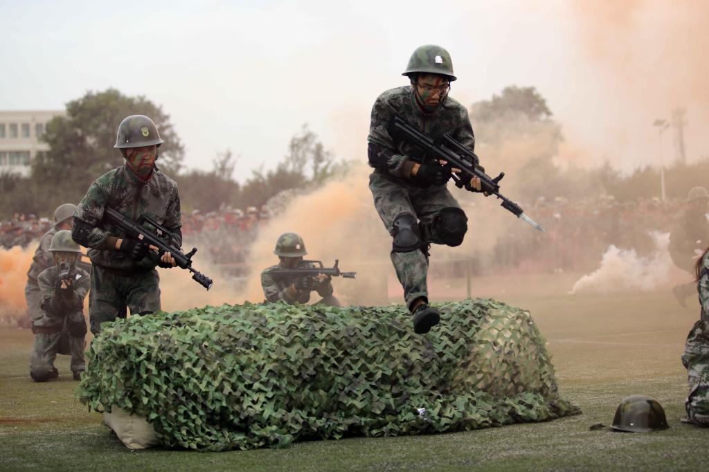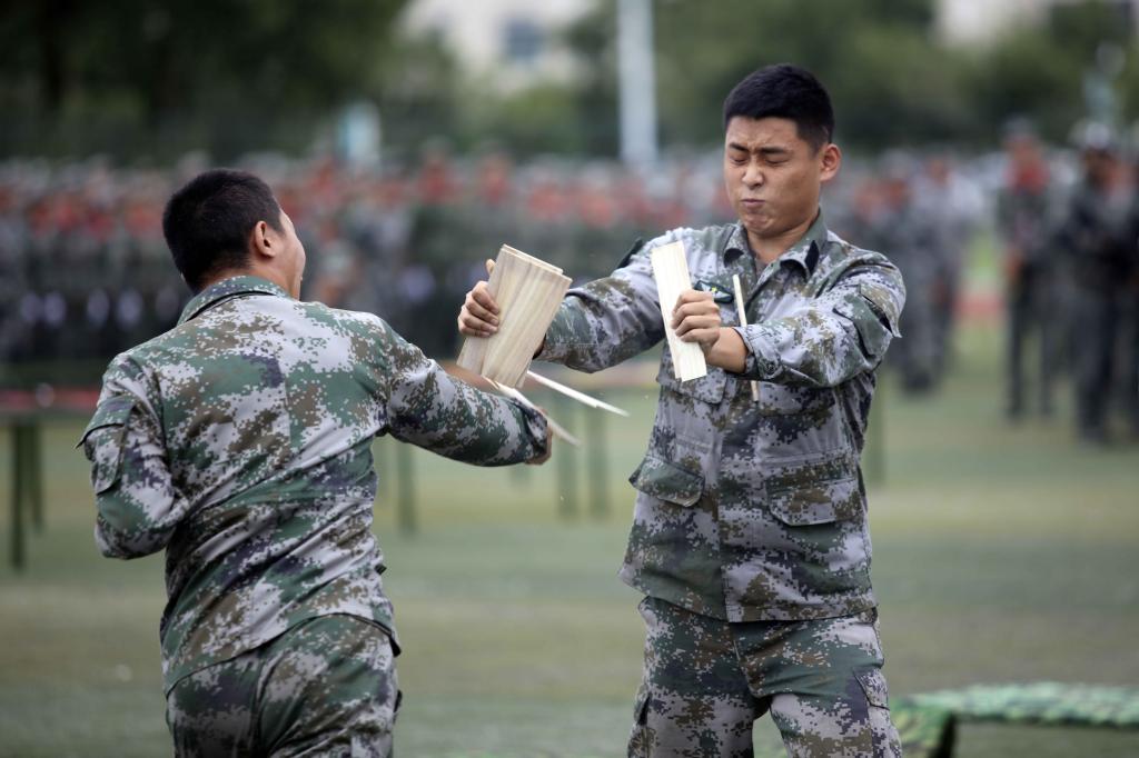 军训成果汇报在庄严的国歌声中拉开序幕。2021级新生军训方队迈着整齐的步伐依次走过主席台。他们队列整齐、英姿勃勃、意气风发,以标准的军姿和高昂的士气展示了13天的军训成果。13天里,他们接受挑战、磨练意志、蜕变自己,争取把每个细节做到位,直冲云霄的嘹亮口号以及规范有力的庄严军礼是他们挥洒汗水、蜕变成长的最好证明。成果汇报精彩纷呈,各系院方队依次登场。英姿飒爽男儿郎,刺杀操、擒敌拳、战时救护表演方队轮番上阵,一套套动作利落干脆,一招一式强劲有力,呐喊声震天,气势恢宏,赢得了热烈的掌声。