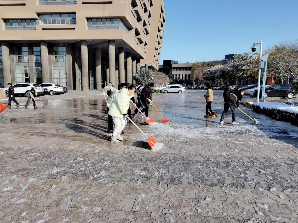 院办公室(党委办公室)提前与物业进行对接,落实学校清理积雪安排,积极参与其中。今日清晨,7名党员和6名普通人员一同利用铁锹、扫帚等工具,协助物业人员对积雪、结冰的地面进行清理,在上班、上课前完成了立德楼附近主干道的清理工作,师生可以安全到达教学楼,没有发生安全事故。