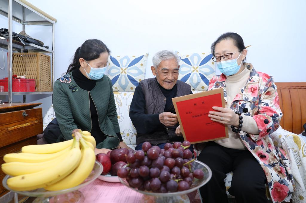 许乃荦是学校首位百岁老人,这位满头银丝的老人见证了学校的发展。许老虽已百岁高龄,但精神矍铄,头脑敏捷,十分健谈。谈及长寿秘诀,子女介绍老人性格特别好,也很自律,每天上午都要出去活动两个小时,呼吸新鲜空气,老人的长寿之道引来一片感慨,更多的是对许老由衷的敬佩。美妙的生日歌在家中响起,工作人员送上生日蛋糕和祝寿对联,祝老人期颐之年福如东海,寿比南山。许老脸上洋溢着幸福的笑容,许下心愿,并表示在校庆之际,祝愿学校越办越好。