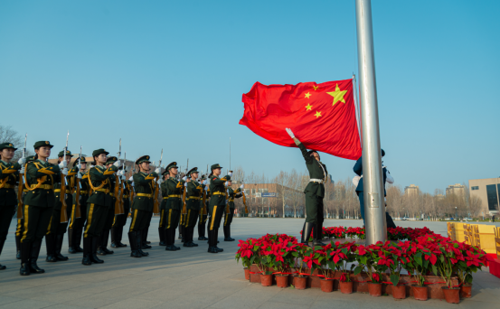 迎着和煦的春风,学校国旗护卫队迈着整齐有力的步伐入场,在慷慨激昂的《义勇军进行曲》中,鲜艳的五星红旗冉冉升起,全场师生齐唱国歌、行注目礼,向国旗致以最崇高的敬意。