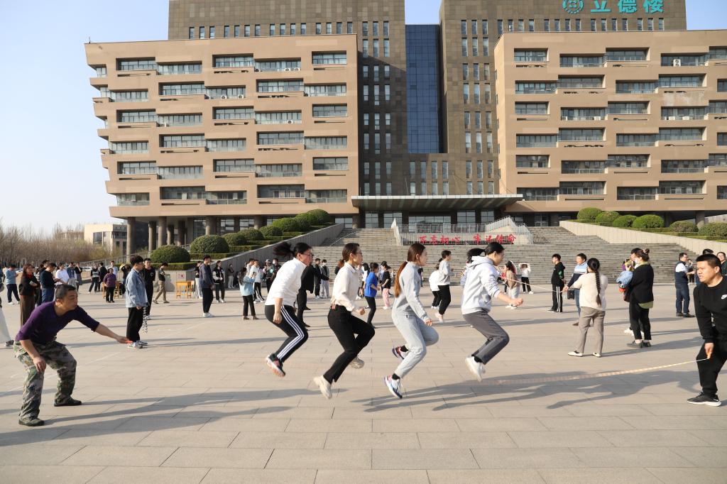 本站讯(通讯员 杜翠翠 冯华 仇静)3月14日下午,校工会组织的2023年“齐心协力跳大绳”活动在北校区立德楼前举行。此次友谊赛共有30支队伍,180名教职工参加。