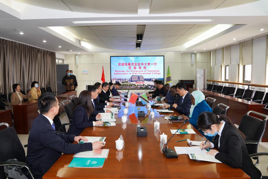 凯鲁基大使一行首先参观了学校的新能源汽车中心和智能制造实训中心。在交流座谈会上,凯鲁基大使介绍虽然他是第一次来淄博,但是两年以前他就知道淄博职业学院。他非常重视淄博职业学院和坦桑尼亚国家交通学院共建中坦汽车鲁班工坊项目,全程关注鲁班工坊建设的过程,特别是疫情期间,两校克服困难,通过视频交流研讨,推进了鲁班工坊的建设。他对今年2月份鲁班工坊招收首批39名学生并顺利开班表示衷心的祝贺,同时希望两校能发扬坦赞铁路精神,把鲁班工坊建设的越来越好。