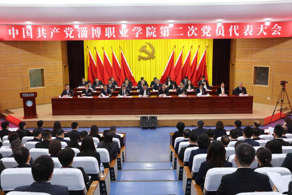 淄博职业学院南校区报告厅,气氛庄重热烈,来自全校各条战线的代表精神饱满地步入会场。主席台正上方悬挂着“中国共产党淄博职业学院第二次党员代表大会”会标,帷幕正中悬挂的党徽熠熠生辉,10面鲜艳的红旗分列两侧。