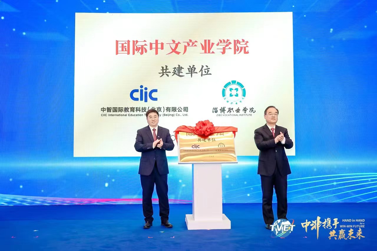 学校党委书记刘伟与中智科技集团党委书记、总经理刘怀增共同为中智-淄博职业学院国际中文产业学院揭牌。该学院由中智国际教育科技(北京)有限公司与淄博职业学院校企合作,共同投资、共同管理,将实现年培训非洲留学生300人次,打造校企深度合作、实质运营的产业学院淄职模式,探索打造“中文+职业技能”人才培养升级方案,为“走出去”企业提供国际化复合型人才。