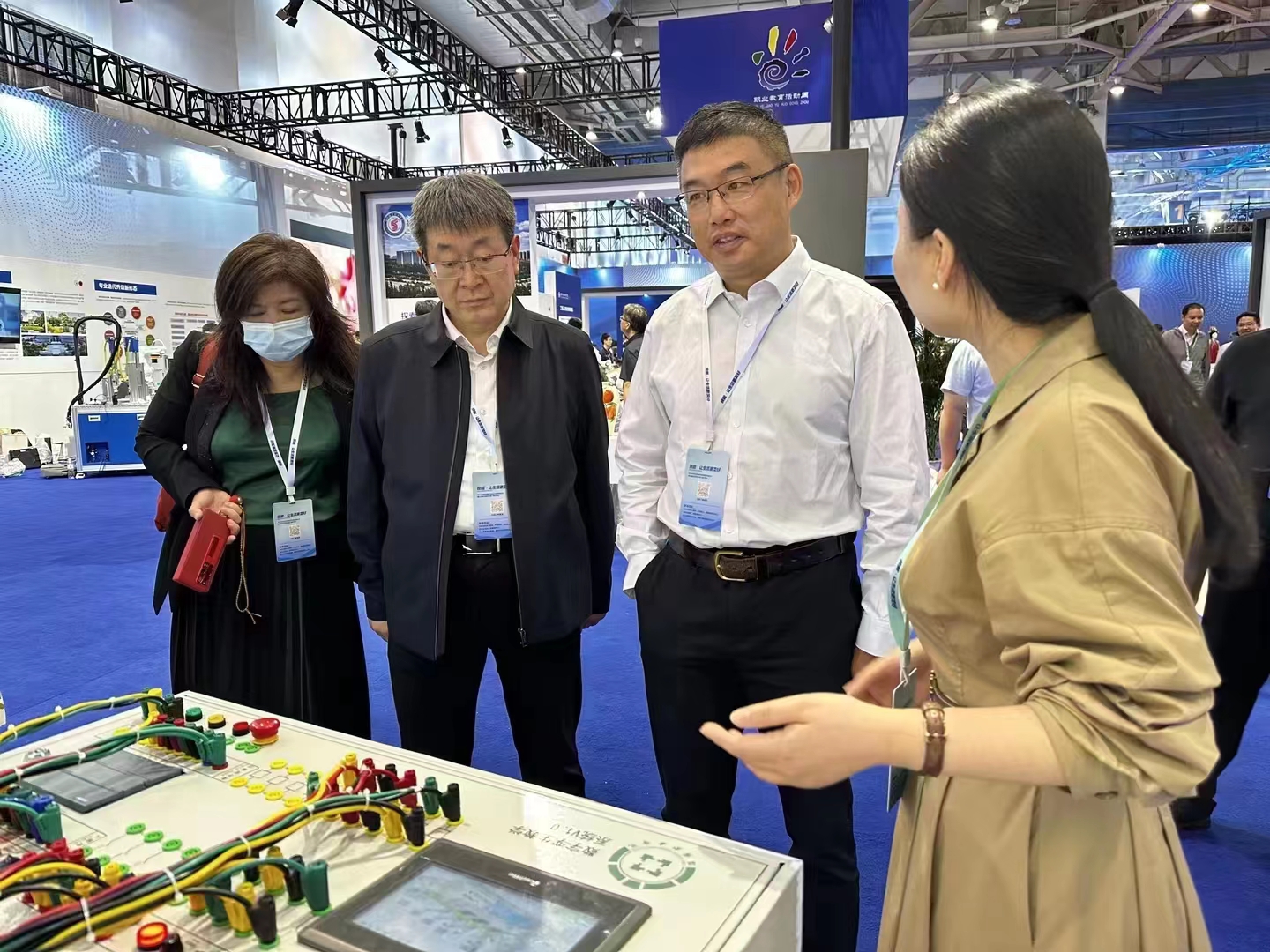 本次展览,学校亮相“制造强国”“一带一路”两个板块。学校以“技能引领,师生共创共研;创新引领,助力企业发展;品牌引领,锻造产业人才大军”为题,通过实物设备、图文、视频等方式,全面展示了学校的人才培养理念、模式和成果,助力“制造强国”。本次重点展出的数字孪生自动化教学系统是由学校师生自主研发,将虚拟与现实技术完美结合,创新性的将数字模型的电气控制信号现实化输出,为学生提供了一个低成本、无危险、多项目的实训平台,并可根据不同学习需要配置各种品牌可编程控制器。该系统的研发已获得发明专利2项,将大大助力我国自动化人才的培养。
