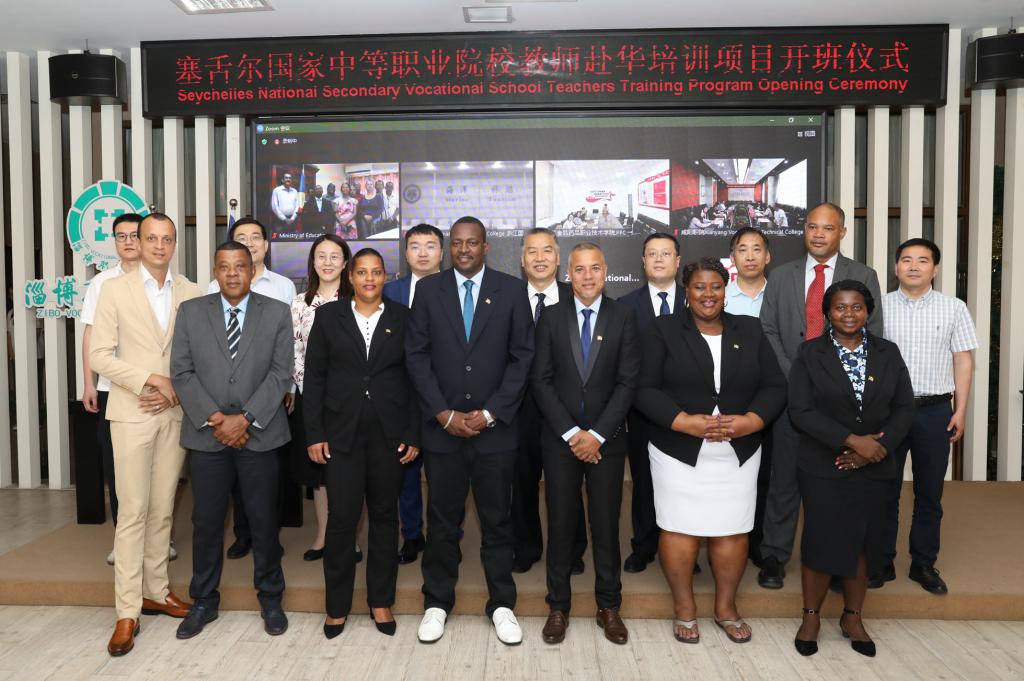 本站讯(通讯员 周涛)5月15日下午,塞舌尔国家中等职业院校教师赴华培训项目开班仪式在学校尚德楼尊客举行,塞舌尔国家中等职业院校8名教师,学校党委委员、副校长李厚永,中智国际教育科技(北京)有限公司总经理段晓飞,山东省职业教育学会副秘书长、中非职教联盟顾问姜义林现场参会,浙江国际海运职业技术学院、咸阳职业技术学院、陕西国防工业职业技术学院、江苏食品药品职业技术学院等承接培训项目院校线上参会。