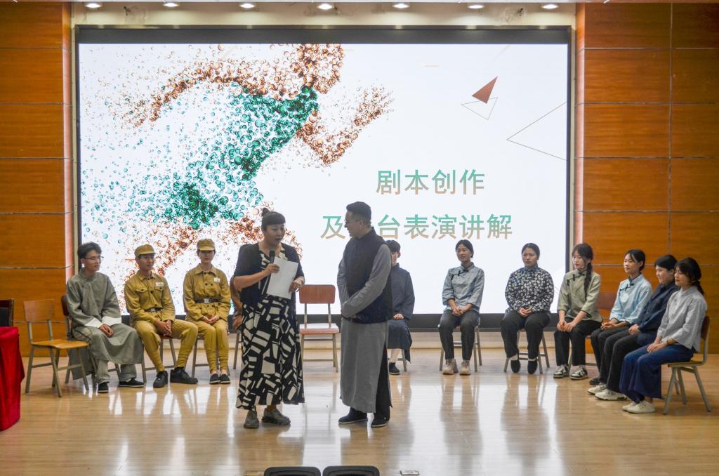 活动中,王桂香老师从语言在话剧中的重要作用和如何进行语言训练等方面进行了详细讲解。申搏学生社团齐声话剧社表演原创话剧《守护》,得到在场师生的好评,表演结束后,尹露老师结合同学们的表演为大家讲解如何进行剧本创作及舞台表演,同学们纷纷表示通过两位老师的讲解对话剧这一舞台表演艺术形式有了更加深刻的理解。