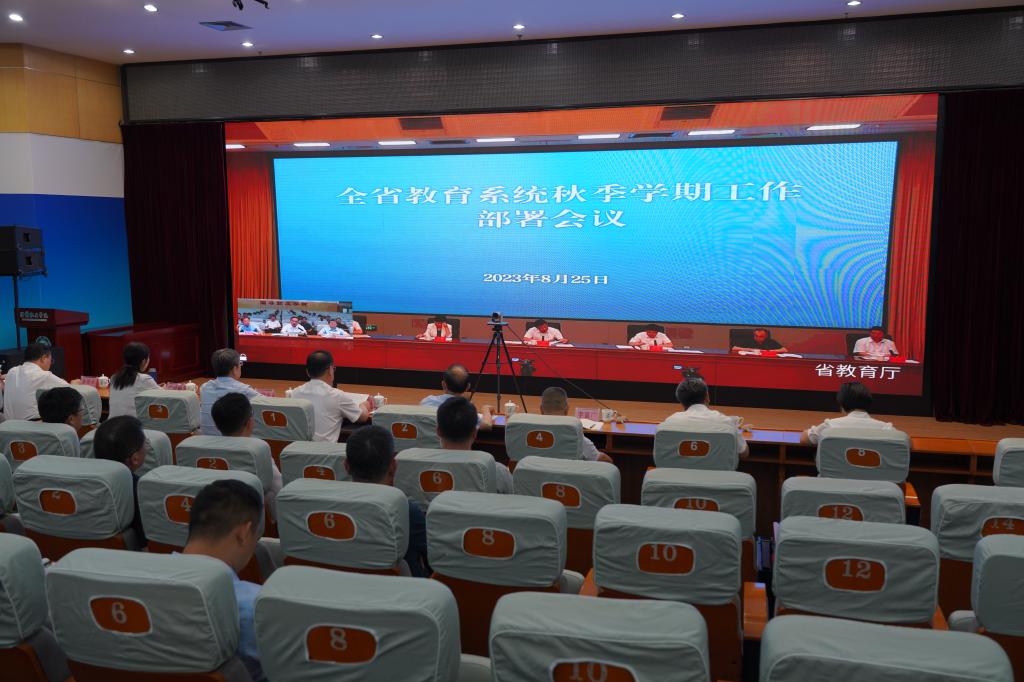 本站讯 8月25日下午,省教育厅召开全省教育系统2023年秋季学期开学工作部署会。省委教育工委常务副书记、省教育厅党组书记、厅长李明出席会议并讲话。学校领导班子成员,院办公室、宣传统战部、质量控制与绩效考核办公室、团委、教务处、学生处、网络信息中心、后勤服务管理处、保卫处、基建处、校医院、产业处负责人,各院系主任(院长)、党支部(党总支)书记在立德楼一楼报告厅参加视频会议。