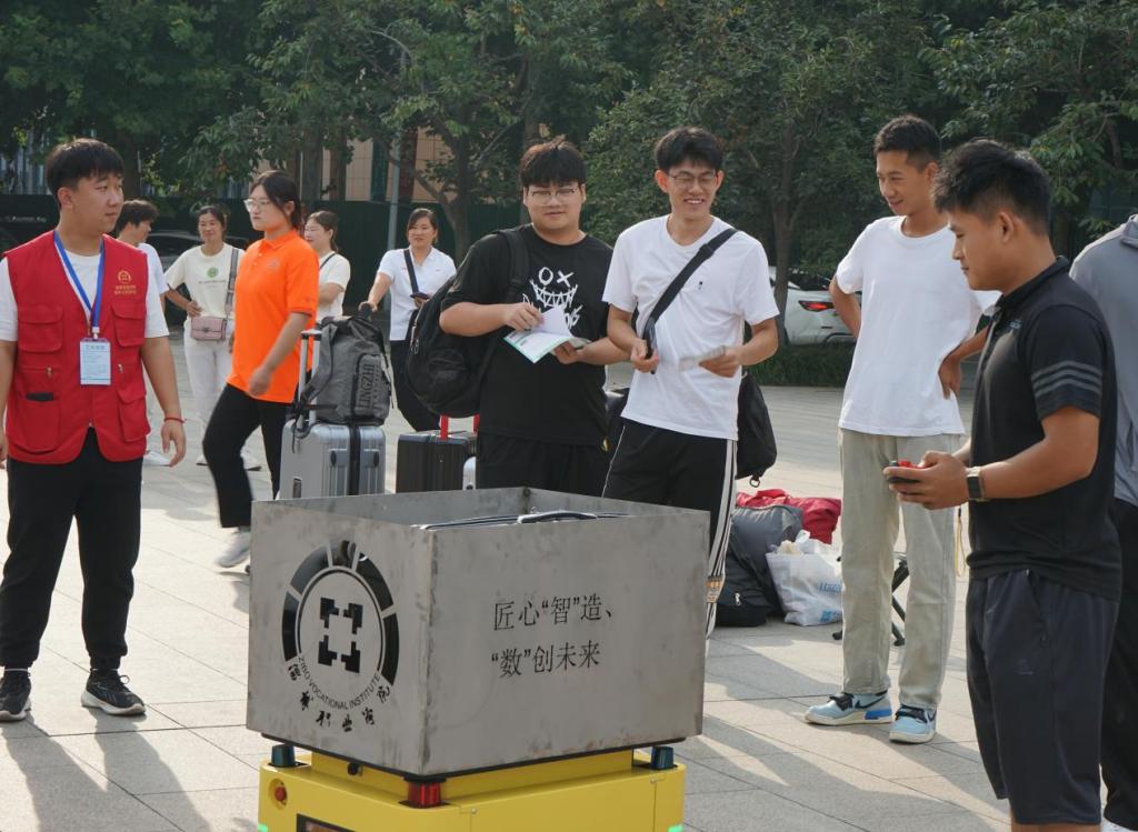 智能制造学院结合专业特色,利用激光切割技术现场设计雕刻入学专属纪念品(钥匙挂件),并制作独具特色的“AGV”智能转运车“智行者”,引导新生报到注册并帮助转运行李。