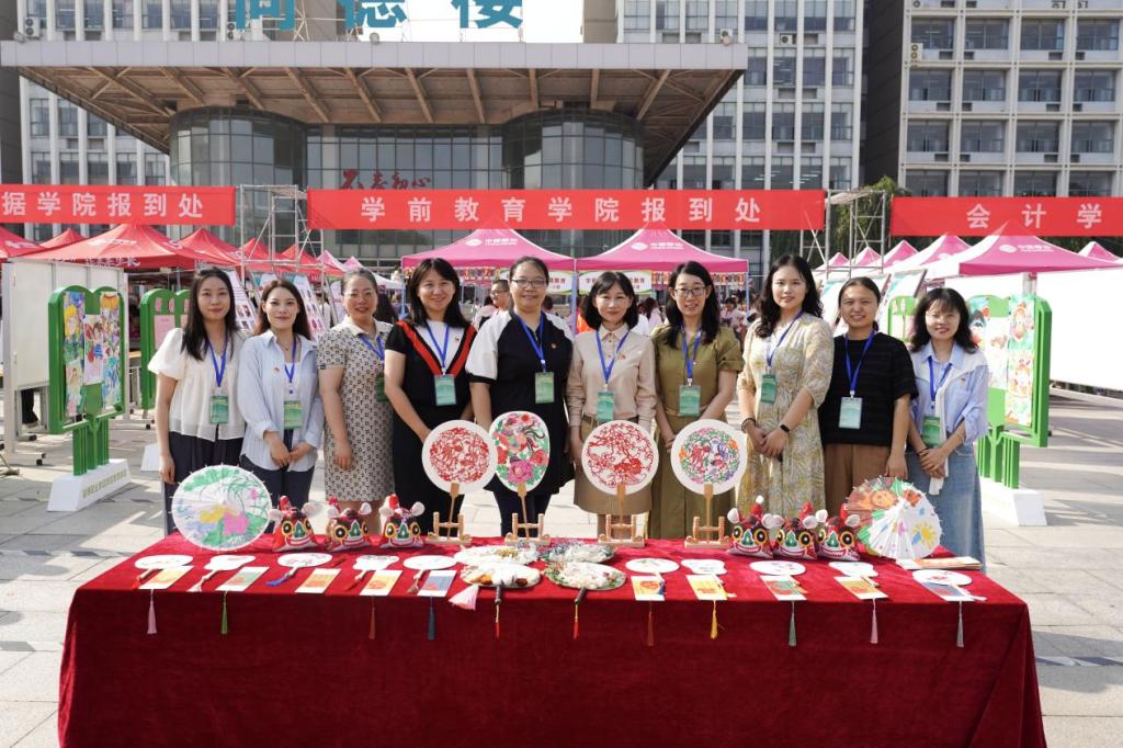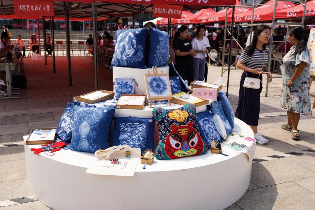 艺术设计系别出心裁地在迎新现场展示了由学生运用草木染扎染非遗技艺设计制作的抱枕、笔记本、香包等作品,并向每一位报到新生都赠送了老师们精心设计的布包。