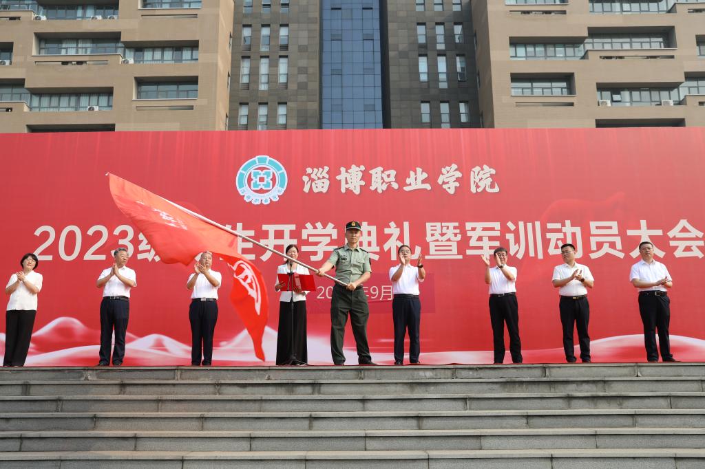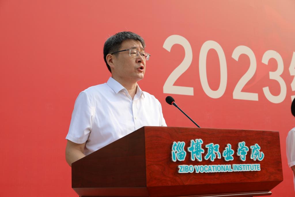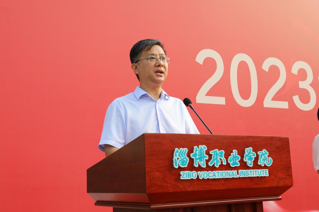 党委副书记、校长孙启友代表学校讲话。他指出,同学们跨越山海来到淄博职业学院,既是同学们青春的选择,也是学校的荣幸,今后同学们将与学校共荣、共生,开启共同陪伴、共同成就的历程。他希望同学们胸怀远大志向,以理想指引方向;锤炼坚韧品格,以拼搏成就未来;真诚待人,以友谊致敬青春,以圆满完成军训课程作为开启大学生活的第一步。