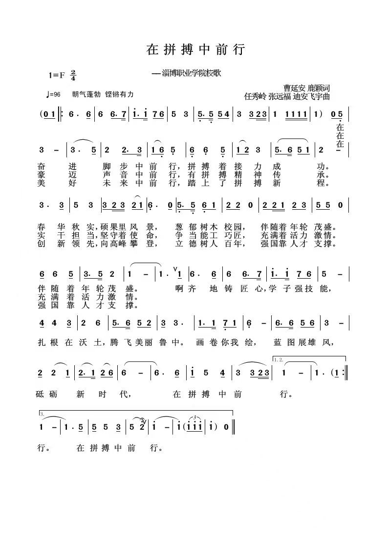 校歌是校园文化的重要载体和办学精神的诗意表达。淄博职业学院校歌《在拼搏中前行》以其饱含深情的歌词以及朝气蓬勃、铿锵有力的旋律不仅反映了学校近70年来特别是20多年来的办学治校成果更展现出一代代淄职人拼搏奋进的精神和为了早日建成中国特色、世界水平职业学校而不懈奋斗的决心。