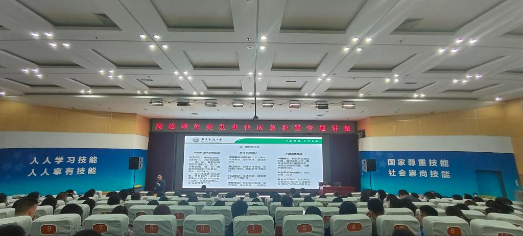 付自生从平安建设发展脉络、责任体系、学生突发事件应急处置、安全风险防范措施等方面做了报告。他结合当前高校安全形势,围绕校园安全隐患排查、学校安全模块、学生伤害事故处理办法等方面,利用丰富的案例与当前热点问题,分层次、多视角地剖析了突发事件的预防手段,并为与会同志细致讲解了应对处置流程及措施。