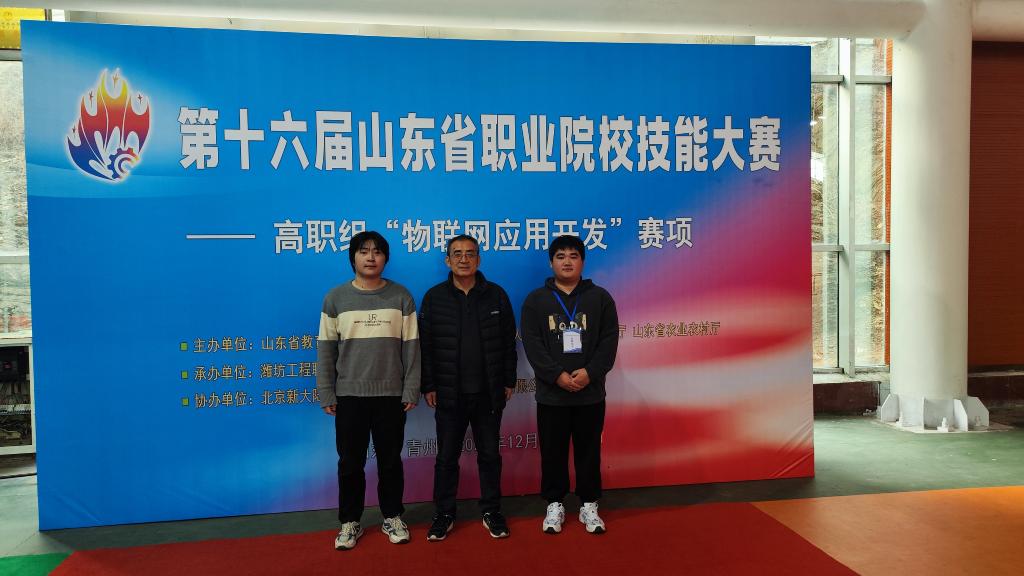 本站讯(通讯员 黄林峰)12月6-8日,山东省职业院校技能大赛“物联网应用开发”赛项在潍坊工程职业学院举行,来自全省的56支参赛队伍同场竞技,经过激烈角逐,我院人工智能与大数据学院单修豪、郑伟两名同学组成的代表队荣获二等奖。