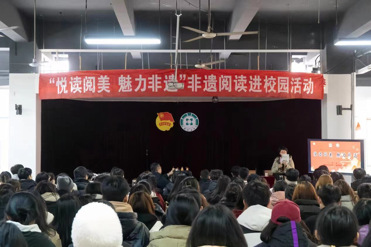 本站讯(通讯员 梁依蕾)12月19日下午,我院在南区第二课堂活动中心开展“悦读阅美 魅力非遗”非遗阅读进校园活动,淄博市联通公司党委委员、副总经理陈抒啸,周村区文化和旅游局党组成员、副局长刘涛,周村区图书馆馆长丁磊,学院党委委员、副院长辛爱梅,及周村区文化和旅游局、周村区图书馆、淄博联通周村分公司相关工作人员,学院相关处室负责人、各院系团总支书记以及学生150余人参加活动。