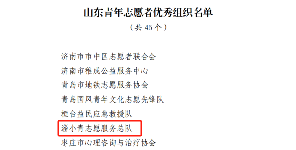 本站讯(通讯员 杨鸿基)12月29日,山东省青年志愿者协会发布《关于表扬2023年度山东青年志愿者优秀个人、工作者和组织的通知》,我院淄小青志愿服务总队获山东青年志愿者优秀组织称号。