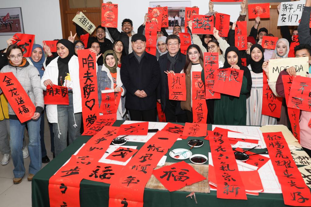 在南区8号学生公寓,刘伟、孙启友等与寒假留校留学生亲切交谈,了解了同学们的生活状况,并祝愿留学生们新春快乐、学习进步。
