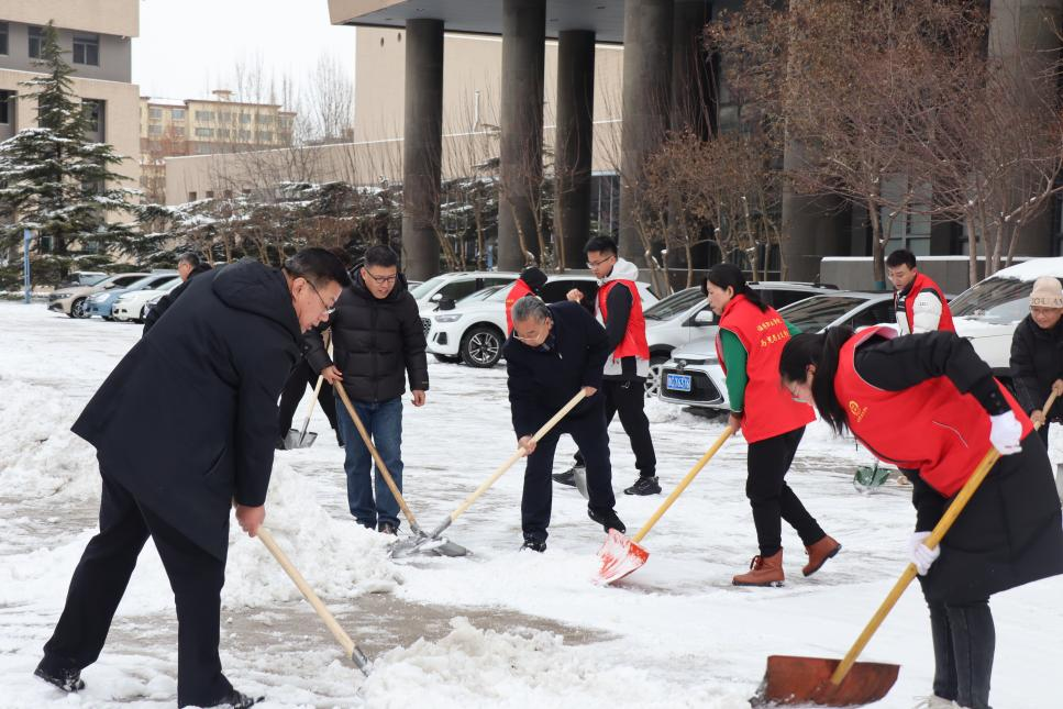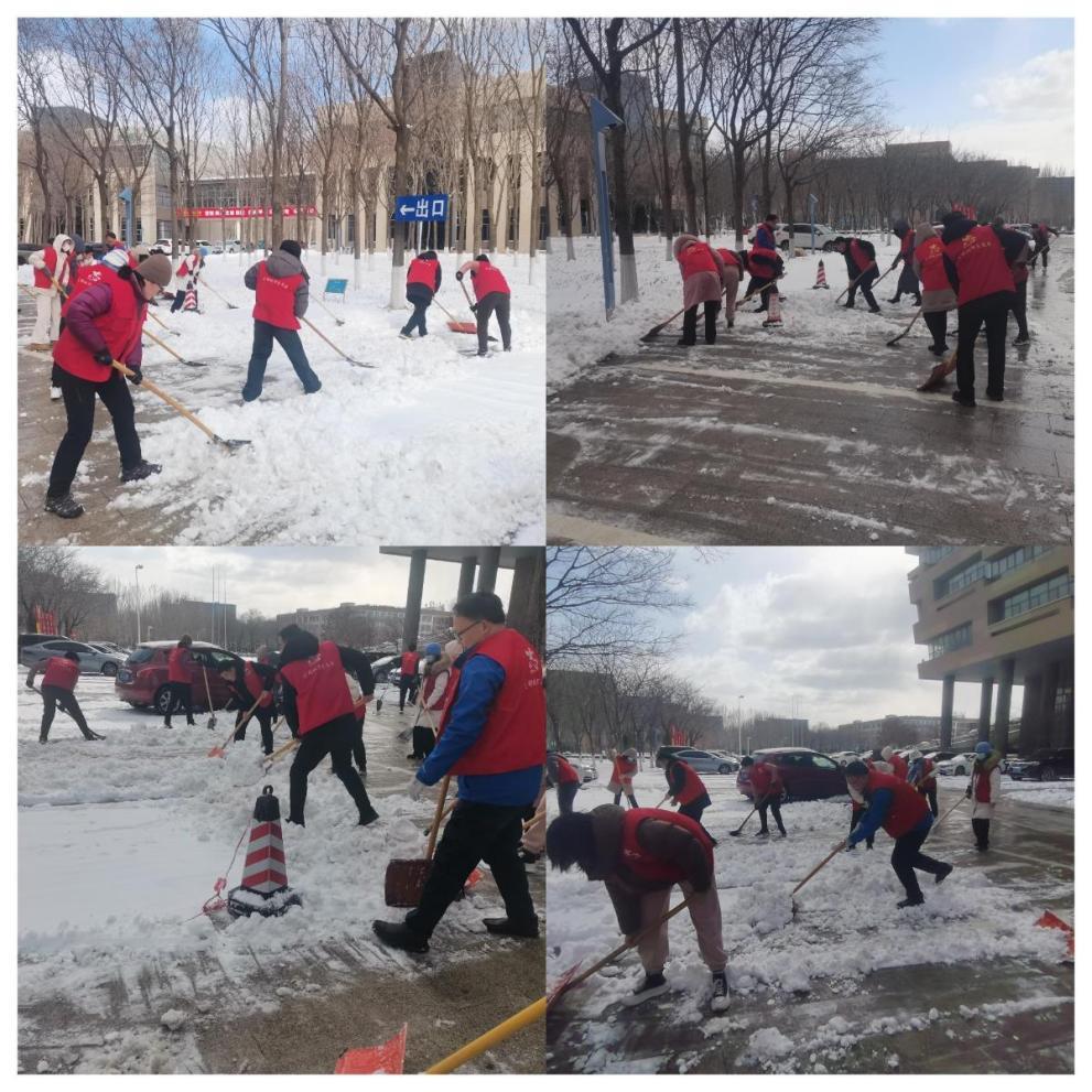 又下了一天一夜的大雪,伴随着初升的朝阳,终于在第二天一早停了。提前撒下的融雪剂起了作用,路面经过车轮碾压,大部分积雪都融化了。各处室、院系党员干部、教师以及后勤一线工作人员继续开展扫雪除冰工作,路面积雪较厚的冰层铲除难度大,大家纷纷用铁锹将冰面敲碎,再用扫帚、铲子等将其堆放至一侧,大家通力合作、轮番上阵,铁锹碰撞地面的“咔咔”声混着扫帚与雪的“沙沙”声在大雪天里演奏了一曲“开学保障进行曲”,团结协作的扫雪场景也成为了严寒校园里一道靓丽的风景。