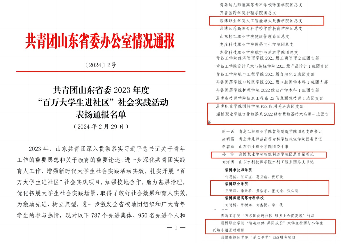本站讯(通讯员 朱梦雪)3月6日,共青团山东省委通报表扬了2023年度“百万大学生进社区”社会实践活动相关集体与个人。我院人工智能与大数据学院团总支荣获“高校院(系)团委(总支)先进集体”;国际学院P23应用英语班团支部、文化旅游系2022级智慧旅游技术应用一班团支部荣获“高校团支部先进集体”;智能制造学院团总支副书记孙雪荣获“市属高校青年指导教师先进个人”;王锦洋、李天骄等5位同学荣获“各市高校青年学生先进个人”;“智趣相伴 共同成长”大学生社团与小学生兴趣小组互动项目荣获“示范项目”。