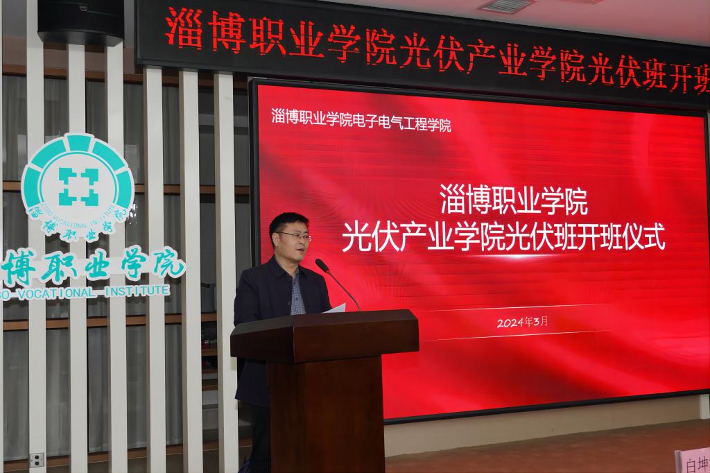 仪式上,张成山表示光伏产业具有广阔的发展前景和巨大的市场潜力,光储充技术是未来能源发展的重要方向。本次光伏班的开设,正是基于这样的时代背景和行业需求。希望光伏班能够成为学院专业特色发展的重要品牌,展示学院在新能源领域的实力和成果。