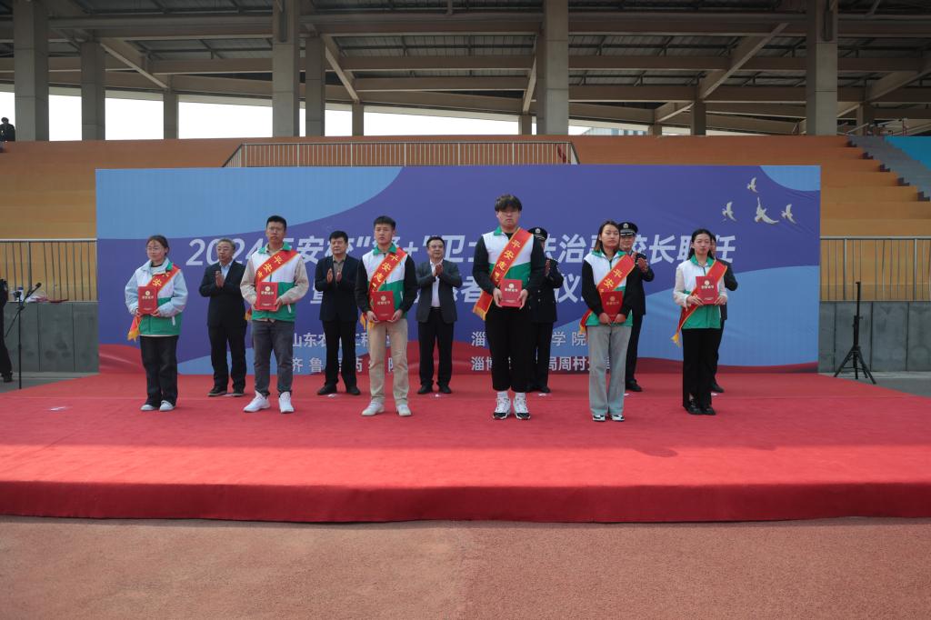 仪式上,淄博市公安局周村分局表彰了我院2023年度20名优秀安校“警+”卫士和100名优秀学生平安志愿者,并公布了2024年度新聘任安校“警+”卫士名单。毕思勇代表学院宣读了《关于聘任2024年法治副校长的决定》,聘任淄博市公安局周村分局北郊派出所杜平、李琳为我院法治副校长,明确了法治副校长的聘期与主要职责。工商管理学院学生工作负责人薛健作为优秀安校“警+”卫士代表、建工学院同学王显傲作为优秀平安志愿者代表分别进行发言,与会平安志愿者还在现场作出了庄严宣誓。