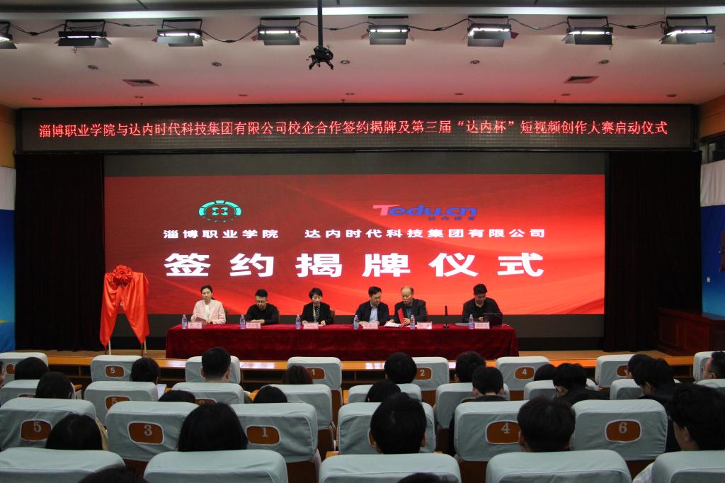 本站讯(通讯员 李锋)4月11日下午,人工智能与大数据学院与达内时代科技集团有限公司在学院北区报告厅隆重举行校企合作签约揭牌仪式,并成功启动第三届“达内杯”短视频创作大赛。达内时代科技集团有限公司教研副总裁Lucy,区域总经理任文博,鲁津区域总监焦杰光,学院党委委员、副校长张成山,人工智能与大数据学院院长孙宾及党总支书记查欣参与此次仪式。启动仪式由孙宾主持。