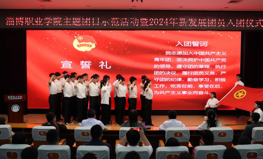 仪式上,项洋宣读了淄博职业学院2024年新发展团员名单;与会领导和老师们为新团员代表颁发团员证,佩戴团徽;新团员在优秀团员孙梦瑶的带领下,面向鲜红的团旗庄严宣誓。