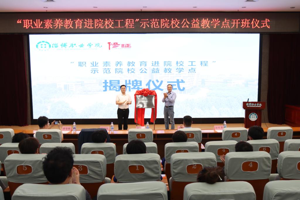 在揭牌开班仪式上,许琼林与张成山共同为“职业素养教育进院校工程”示范院校公益教学点揭牌,并向学生赠发《职业素养》教材。