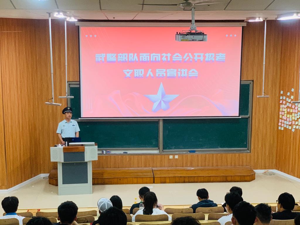 本站讯(通讯员 盛鑫甜)6月7日下午,校企合作与就业指导中心、保卫处(征兵工作站/武装部)携手武警淄博支队在北区1215举行武警部队招考部队文职人员宣讲会,汽车管理学院、人工智能与大数据学院共计100余名学生参会。
