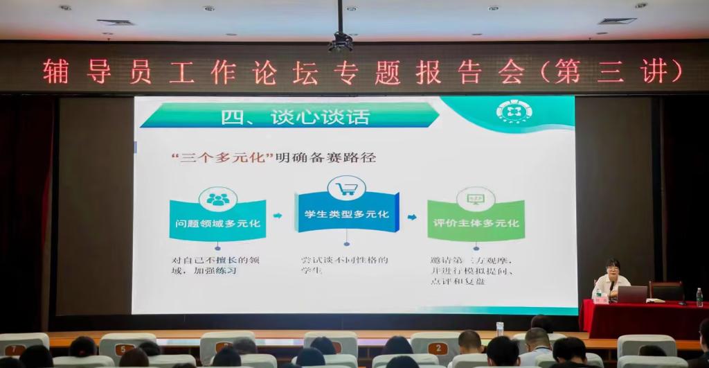 赵翔以“大赛促成长 赋能再出发”为主题,从“辅导员素质能力大赛备战经验”和“以赛促学以学提能”两个方面进行专题分享。首先,她从自身参赛经验进行导入,启发现场老师思考辅导员素质能力大赛的意义。其次,她分别对“基础知识测试”“理论宣讲”“案例分析”“谈心谈话”等模块的备战策略和解题思路进行详细讲解。最后,她强调辅导员工作要聚焦“内涵提升、全面规范、师生满意”,把大赛和日常工作紧密结合起来,积极参与各项活动,以赛促提升。