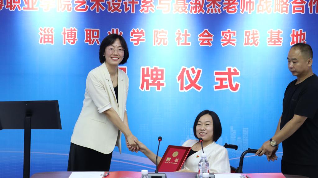 淄博职业学院艺术设计系聘任聂淑杰老师为校外社会实践指导教师,为“聂淑杰爱心助残文创工坊”揭牌,并举行助残签约仪式并赠送相关设计产品等。揭牌仪式后,与会人员在工作人员的引导下实地参观怡佳残疾人综合服务中心,详细了解残疾人就业创业、直播电商、儿童康复等工作情况。同时,淄博职业学院学生代表与部分残疾人座谈交流,了解残疾人实际需求,为今后合作奠定良好基础。