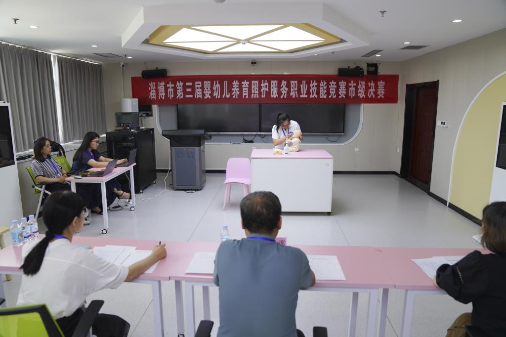 本次竞赛由淄博市卫生健康委、市总工会、团市委、市妇联、市教育局、市人社局主办,市婴幼儿养育照护服务行业协会、淄博职业学院承办。来自全市的托育机构及院校的19支代表队齐聚一堂,同台竞技,充分展示了参赛选手的婴幼儿养育照护服务技能及职业风貌。