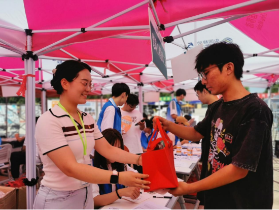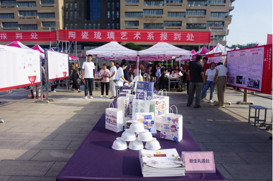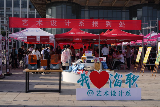艺术设计系根据自身学科特色,精心设计一系列文创产品丰富迎新活动,引得不少学生和家长驻足观看。在迎新现场展示由师生运用草木染扎染非遗技艺设计制作的抱枕、帆布包、丝巾等作品;为萌新们准备了专属定制小扇子、“淄职初印象”打卡墙;在多个区域设置了家长休息区,让一路奔波劳顿的家长可以休息。