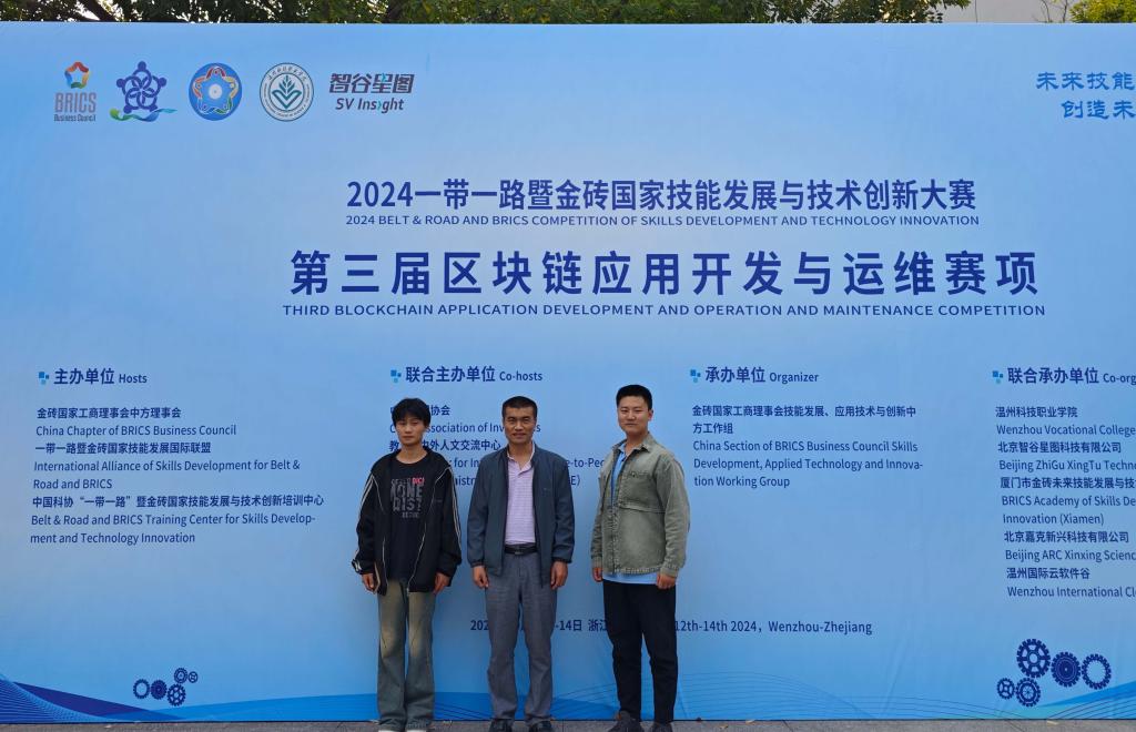 本站讯(通讯员 李锋)10月14日,“2024一带一路暨金砖国家技能发展与技术创新大赛之第三届区块链应用开发与运维赛项国内赛决赛”在温州科技职业技术学院落下帷幕。本届赛事吸引了来自全国179支高职、本科院校队伍参赛。我院人工智能与大数据学院的参赛选手李村和王元浩同学在团体赛中表现卓越,最终荣获二等奖。教师李锋、巩坪荣获“优秀指导老师”的称号,淄博职业学院荣获“优秀组织奖”。