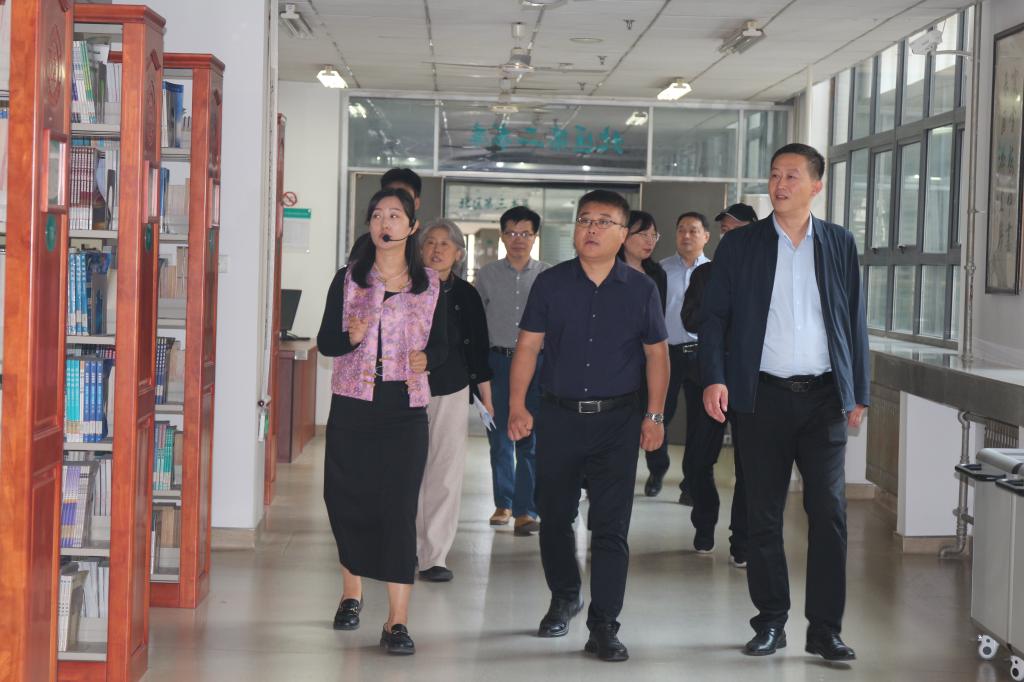 黄磊一行参观了立德楼图书馆一楼多功能大厅以及阅览室和书库,对图书馆规划建设及功能设置进行了详细了解。