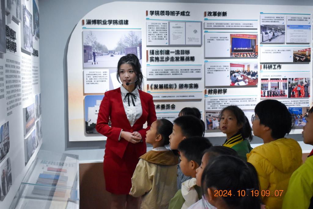 活动当天,小学生们在寻声践履社团学生的引导下,首先来到了淄博职业学院综合馆,孩子们在这里认真聆听讲解,眼神中充满了好奇。孩子们随后参观了马克思主义学院红色文化长廊,长廊展示的内容涵盖中国共产党人的精神谱系、中共历届党代会介绍、齐思政、四史教育、国家重大事件,孩子们充分感受到了红色文化的魅力。在马克思主义学院VR体验中心,孩子们体验情境教学,学习了马克思主义学院思政课教师讲述的《鸡毛信》《小萝卜头》红色小故事,生动有趣的互动,跌宕起伏的情节,极大地调动了学习兴趣,小学生在聆听故事时,深切感受到主人公的爱国情怀和勇敢担当,体会到今天的幸福生活来之不易,激发他们内心对国家的热爱和对民族的自豪感。