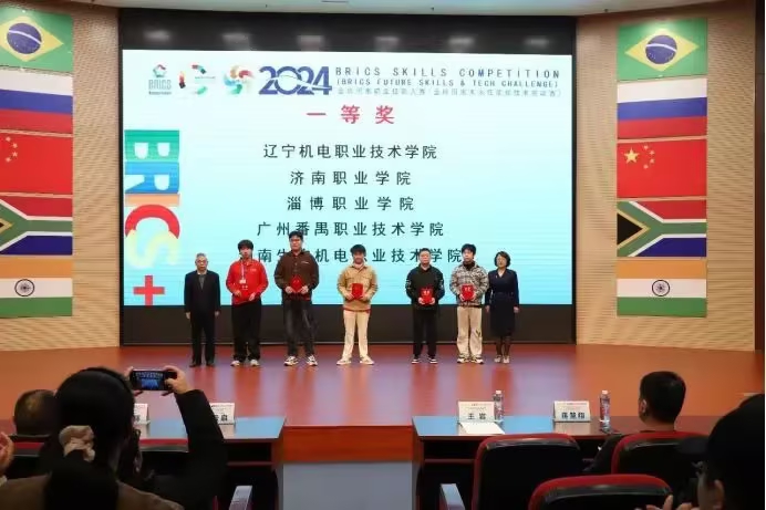 本次大赛由金砖国家工商理事会中方理事会、一带一路暨金砖国家技能发展国际联盟、教育部中外人文交流中心等单位主办,旨在促进金砖国家技能发展和技术交流。大赛以工业机器人数字孪生为核心,以3C行业最典型的异形芯片插件工艺过程以及轨道行业铁轨的焊接打磨为任务主线考核工业机器人码垛、涂胶、装配焊接、打磨等工艺的应用,全面考查学生在工业机器人工作站的虚拟调试、软硬件安装调试、集成应用等工作领域的综合技能和职业素养。
