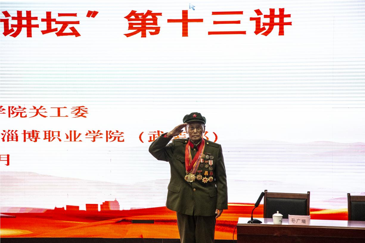本站讯(通讯员 李倩 牛天雨)10月25日上午,淄博职业学院关工委在北区立德楼报告厅举办“红色讲坛”第十三讲。活动由医学技术学院关工委、淄博职业学院(武装部)承办,特邀抗美援朝老兵、“山东省最美志愿者”、淄博市优秀“五老”志愿者孙广瑞做专题报告。学院“五老”志愿者代表、各院系关工委工作人员、离退休工作处相关人员、各院系学生代表、团委相关人员等400余人参加。
