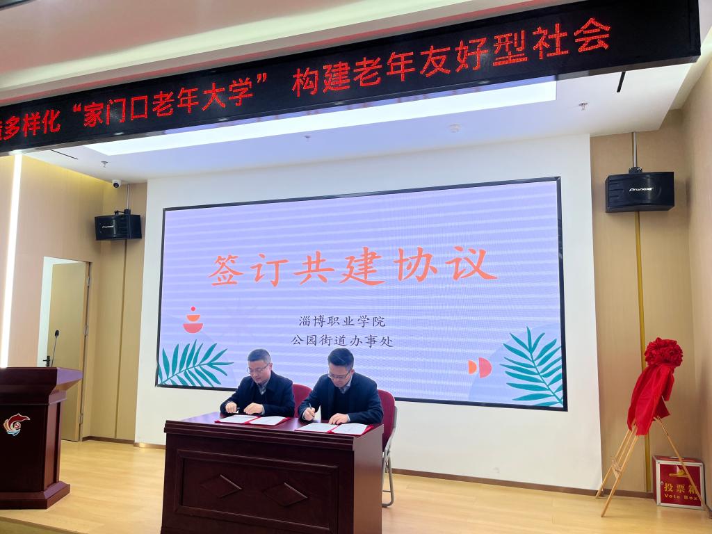 揭牌仪式上,继续教育学院负责人与张店区公园街道负责人签订共建协议;李建波和李碧录为公园街道老年大学揭牌;王军为淄博职业学院授课教师颁发聘书。
