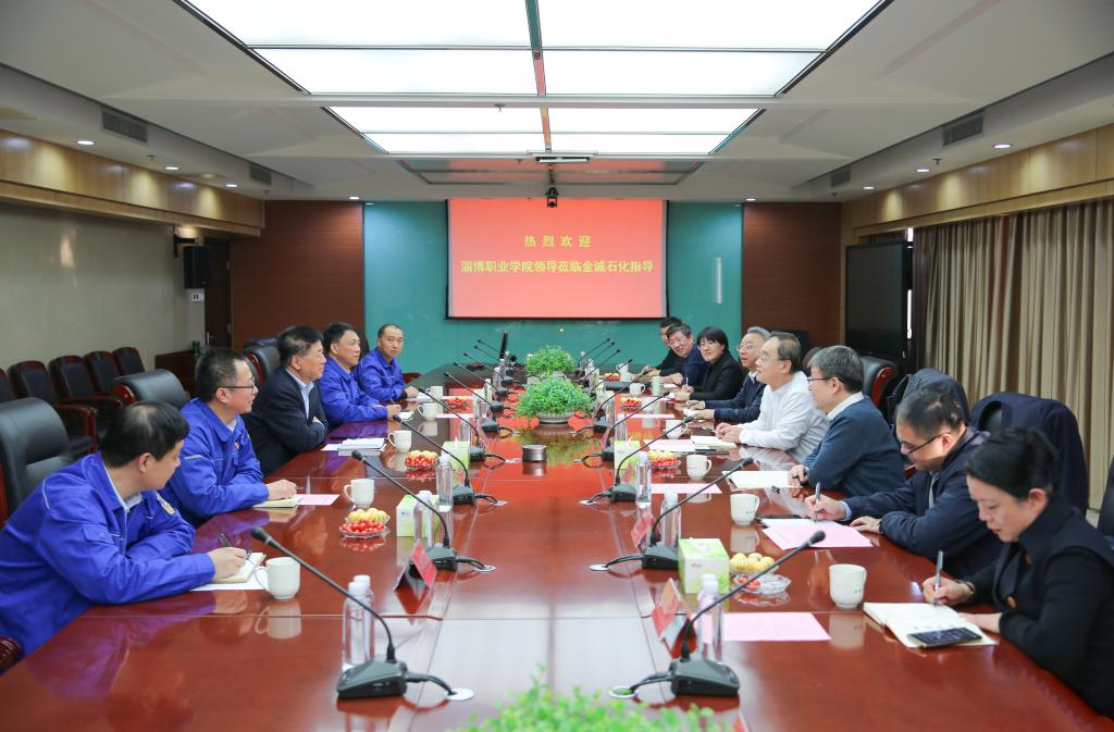 刘伟介绍了学院近年来深化“产教融合、校企合作、育训并举”,聚焦产教融合过程中产业与教育、学校与企业、育人与培训等方面,实现提质培优、增值赋能、以质图强服务省“十强”市“四强”产业,服务淄博的传统产业、支柱产业、新兴产业、未来产业的做法,多年来先后输送了240名毕业生到金诚石化工作,并对金诚石化输送企业技术能手、首席技师为申搏专业建设服务表示了感谢。