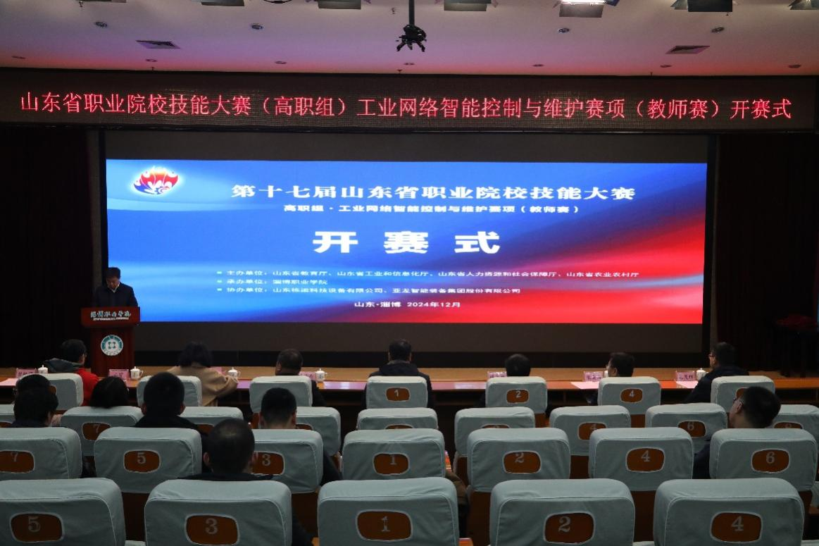 开赛式在淄博职业学院北区立德楼报告厅举行,大赛监督仲裁组组长任有华,专家组组长曾小波,裁判长兰子奇,学院党委委员、副院长张成山,山东栋梁科技设备有限公司制造中心副总经理马辉,亚龙智能装备集团股份有限公司工程师龙茂辉出席,来自全省27支参赛队代表参加此次开赛式。